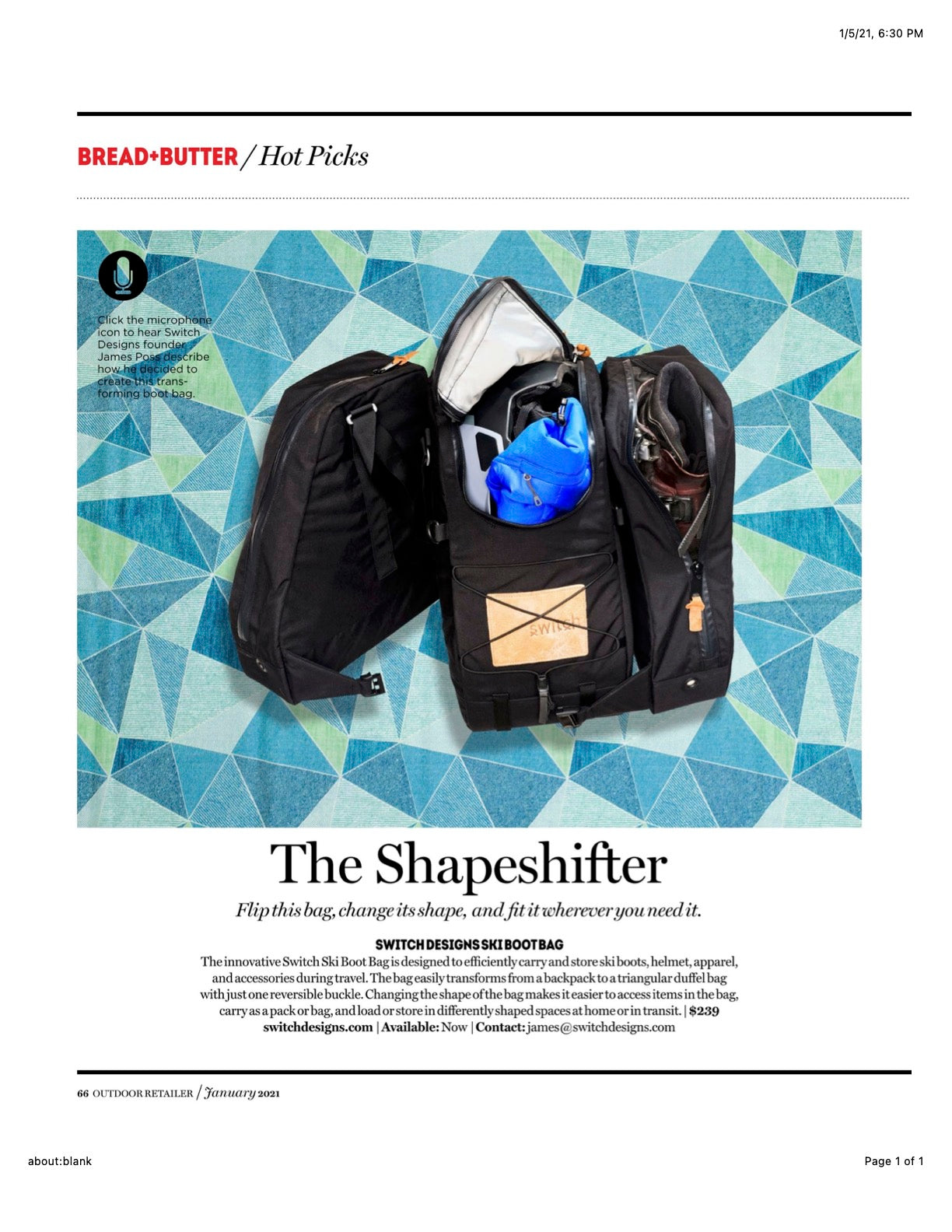 "The luggage we use to transport our gear has remained stale. Switch is looking to change that, and this ski boot bag is a strong start."